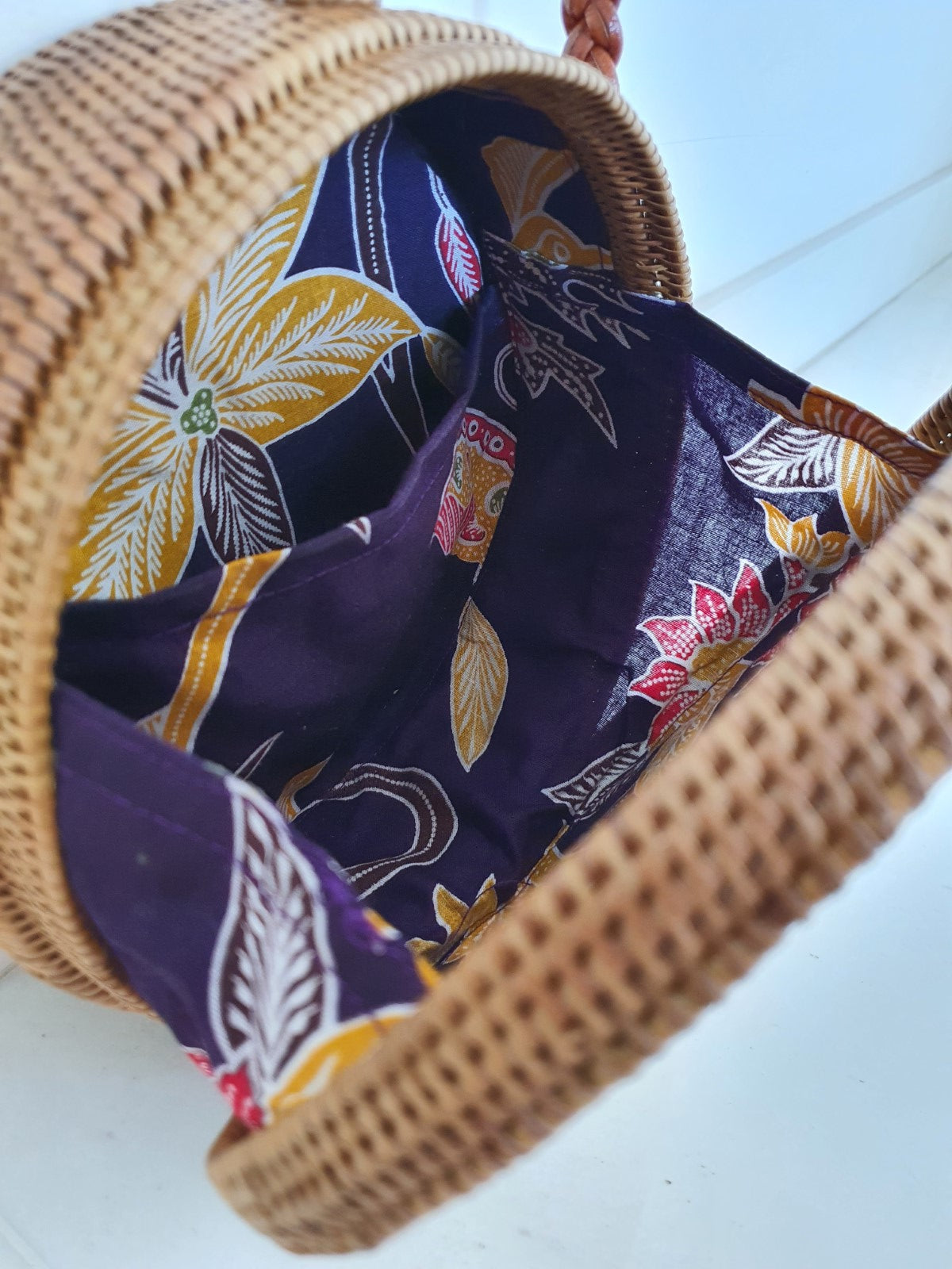 The bag lining is made of hand printed batik fabric and may vary from each bag.