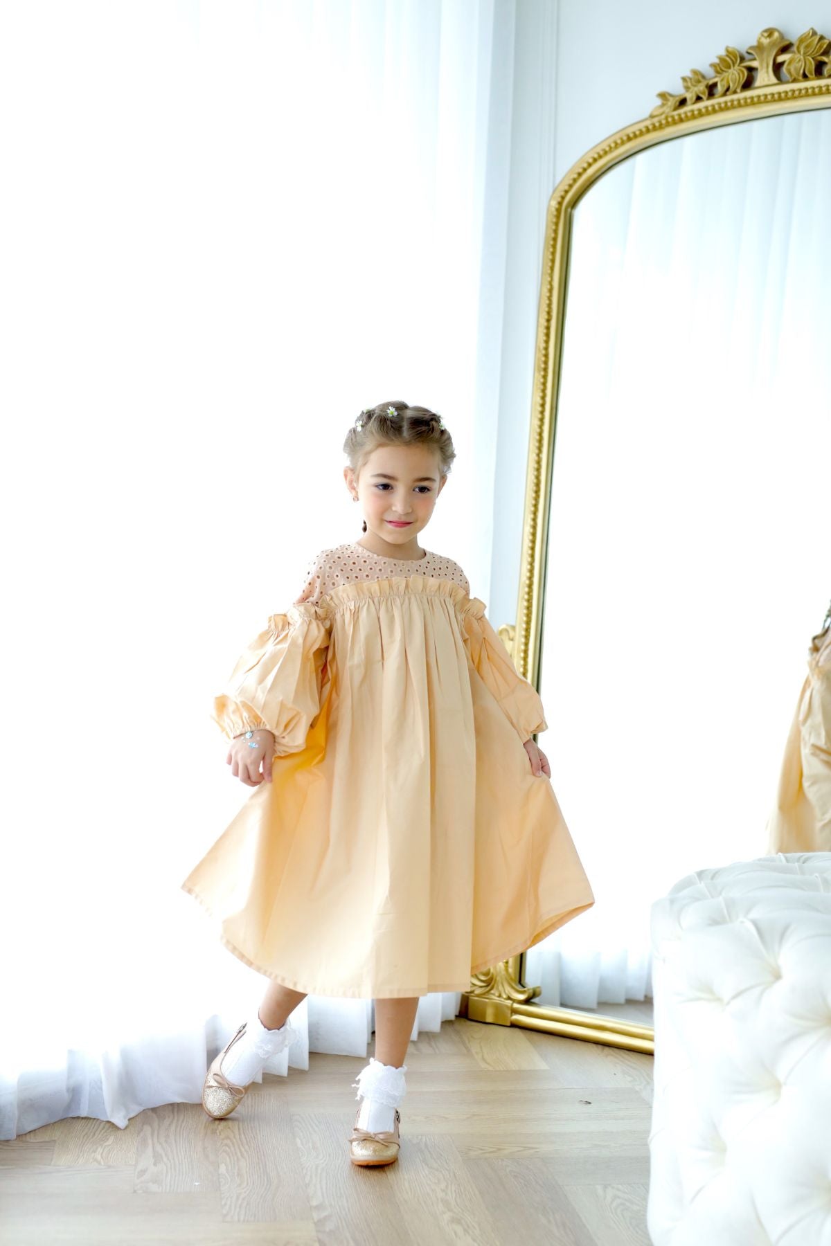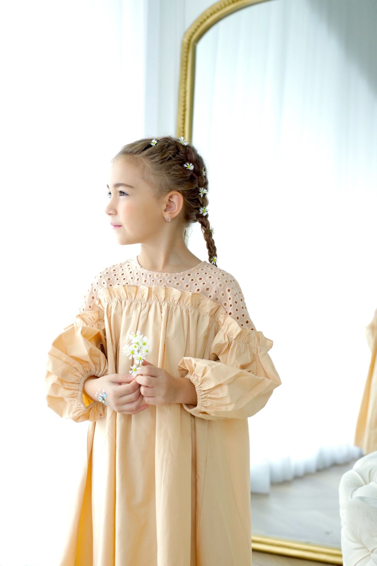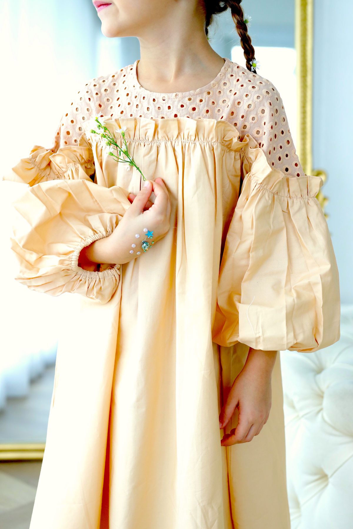 Walk with confidence in this soft beautiful flowy dress. In a midi length with easy pull-over style, plus beautiful details on top, it's a must for their daily wear.