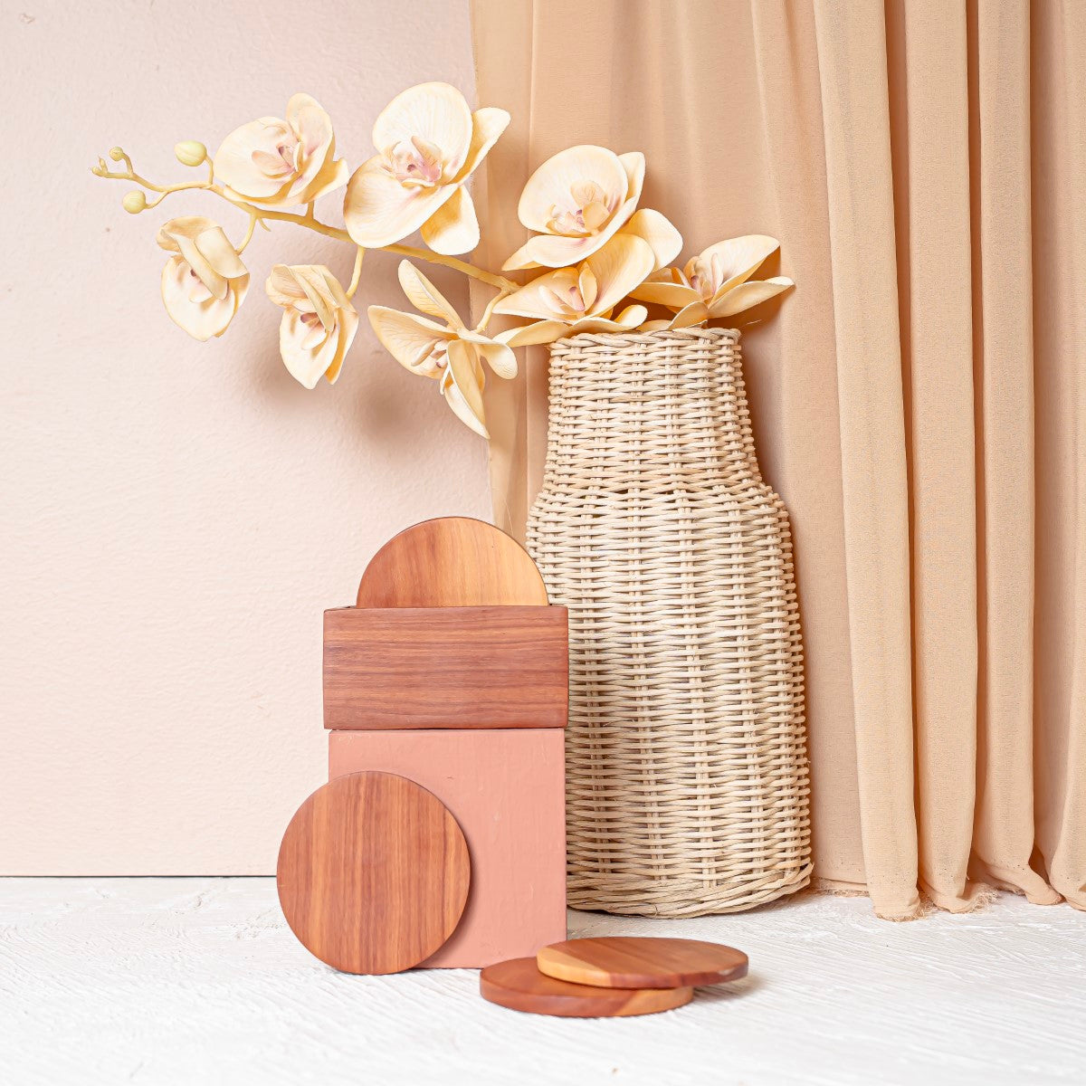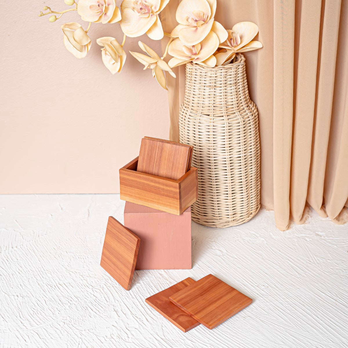 Size - Length: 8.5 cm - Width: 8.5cm Set of 6 + Coaster box Material: sapodilla