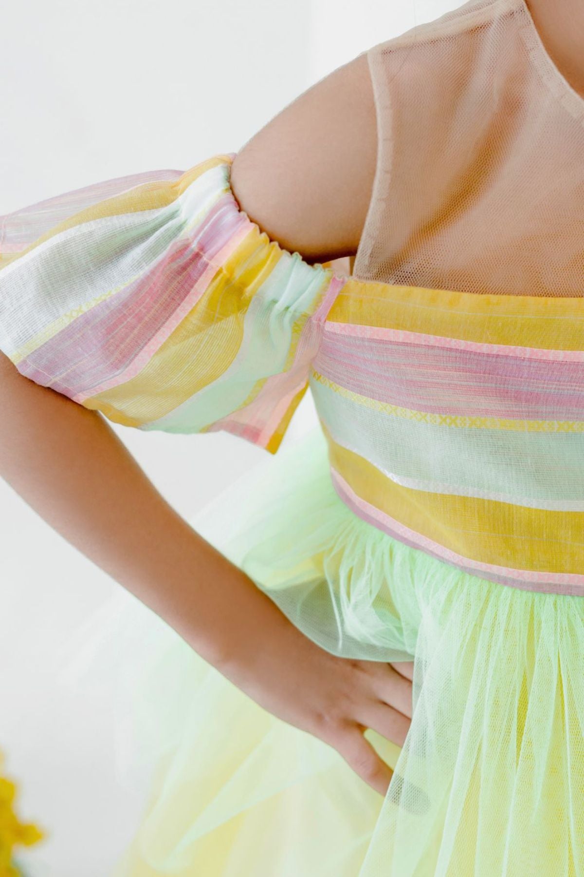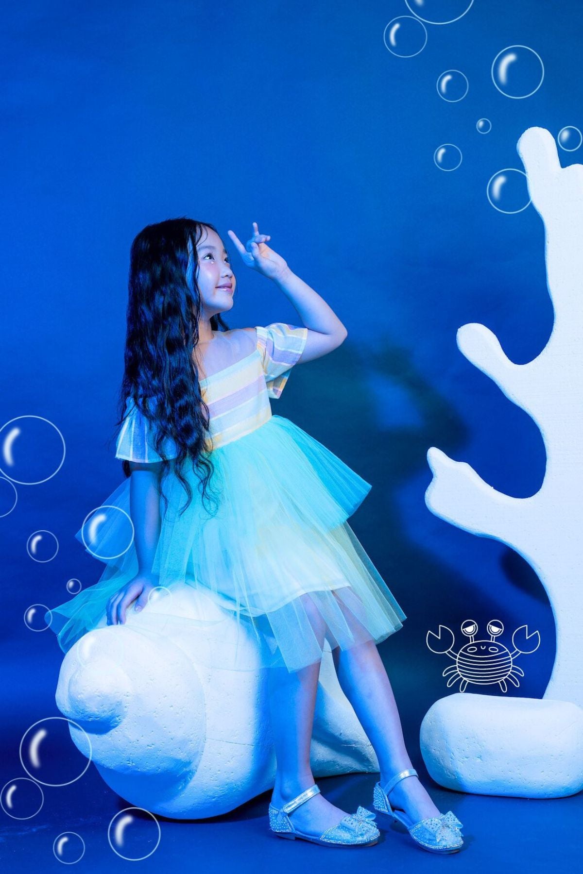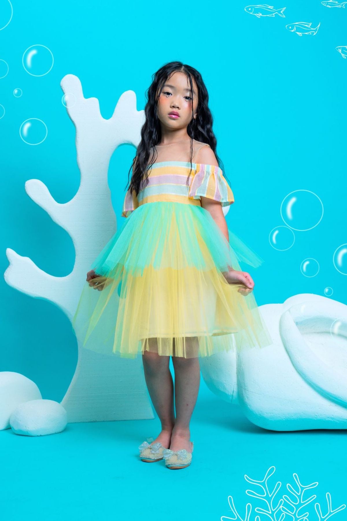 • Shimmer like the sea in our limited edition dress inspired by the Little Mermaid. Made to stand out in a hint of metallic tulle with a peplum hem and tulle underlayers.