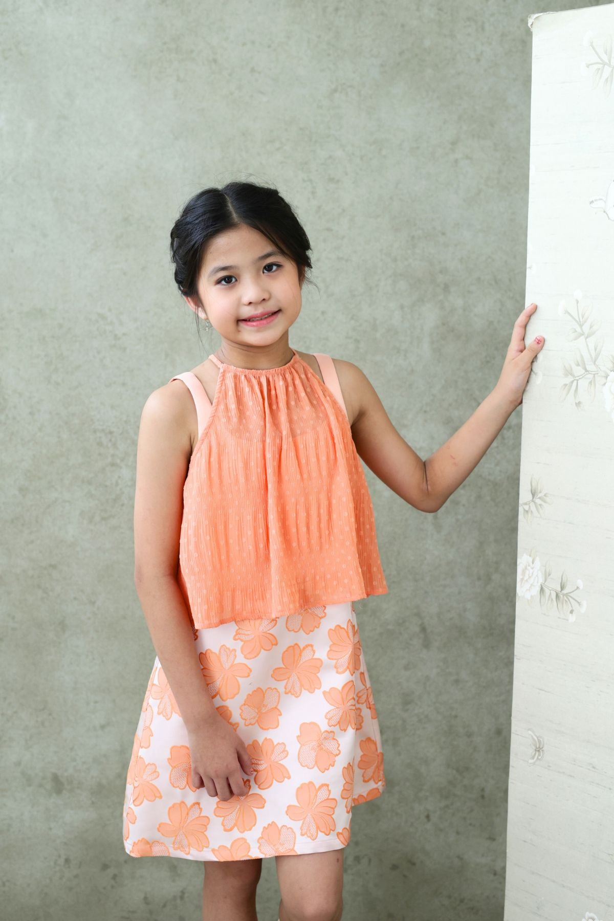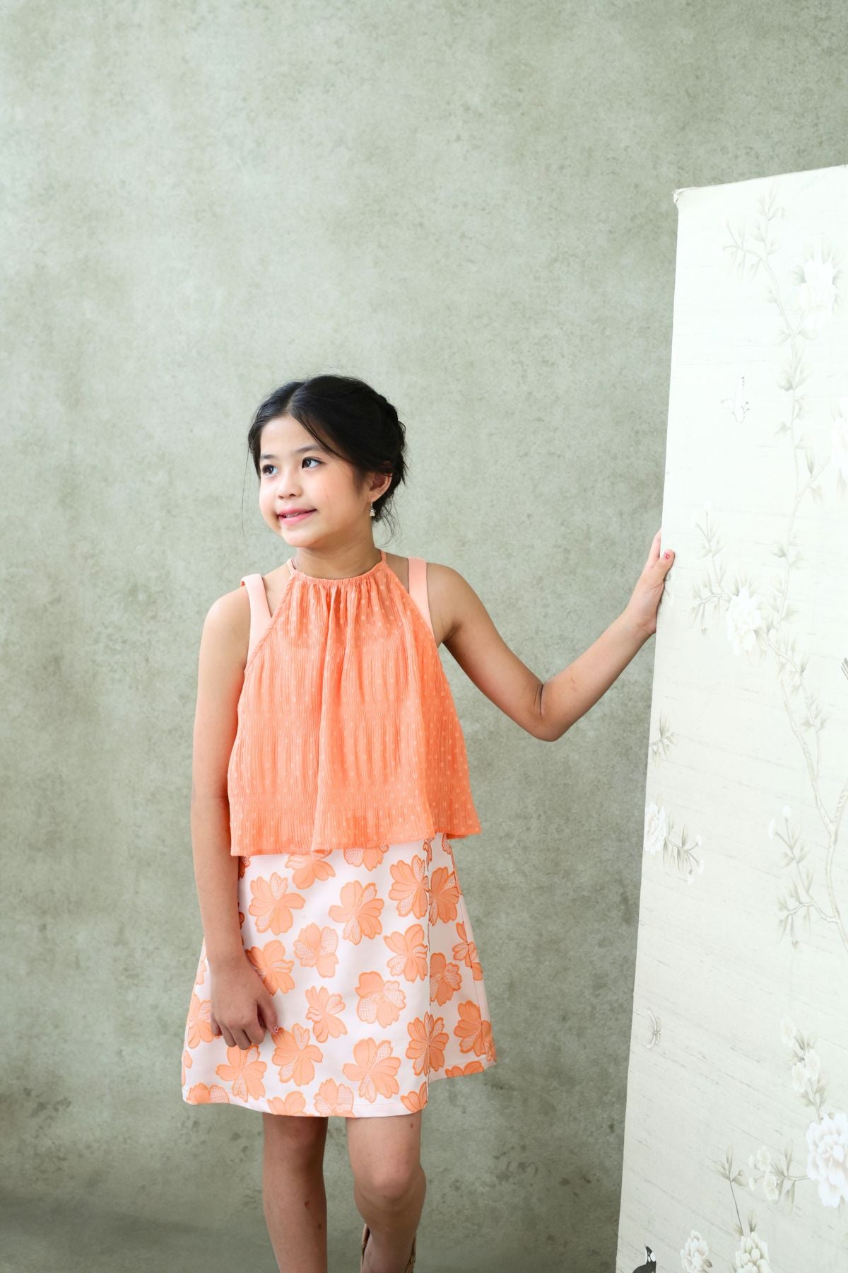 The inner dress features a beautiful floral jacquard pattern in soft peach tones, giving it a timeless yet fun appeal. It’s lightweight, comfortable, and perfect for festive days or special outings. Layered on top is a flowy pleated outer in a warm peach shade, adding movement and elegance with every step. The halter-style neckline and gentle drape create a refined silhouette that still allows for all-day comfort and play.
