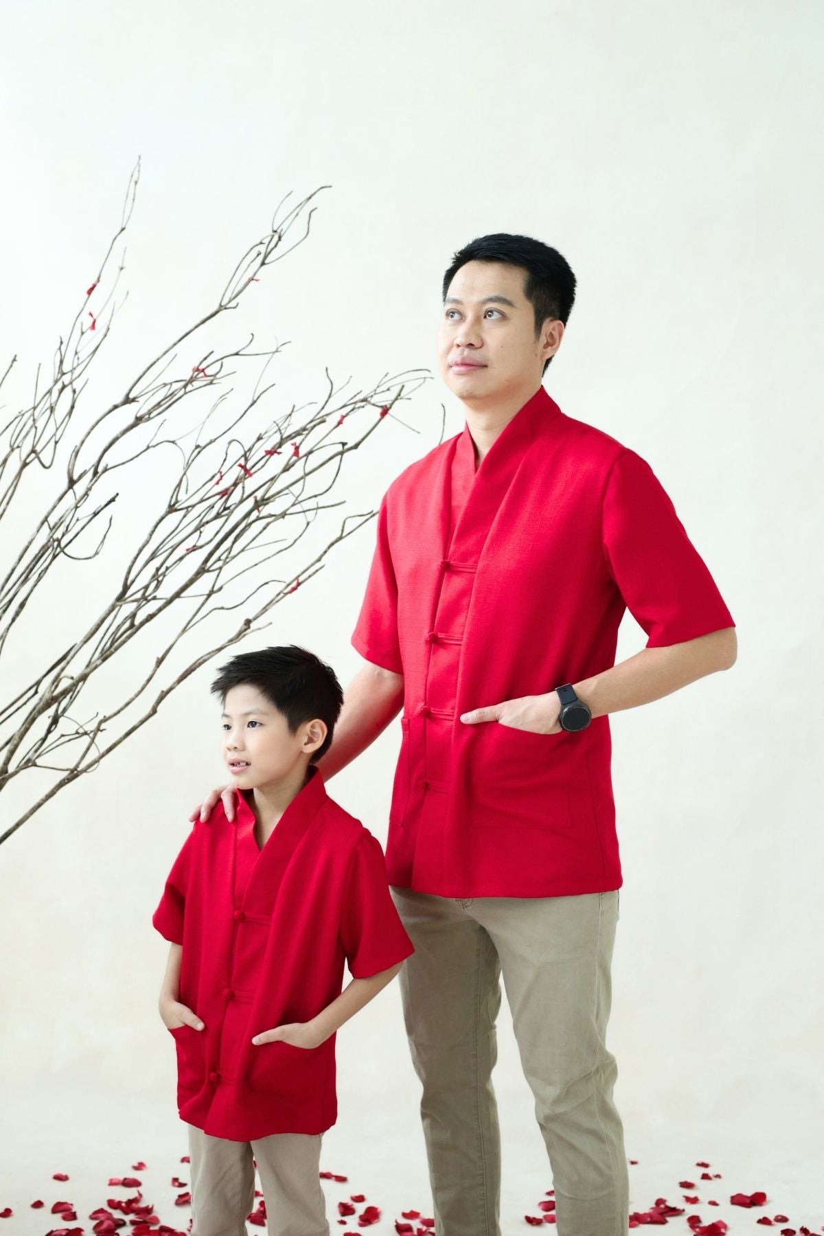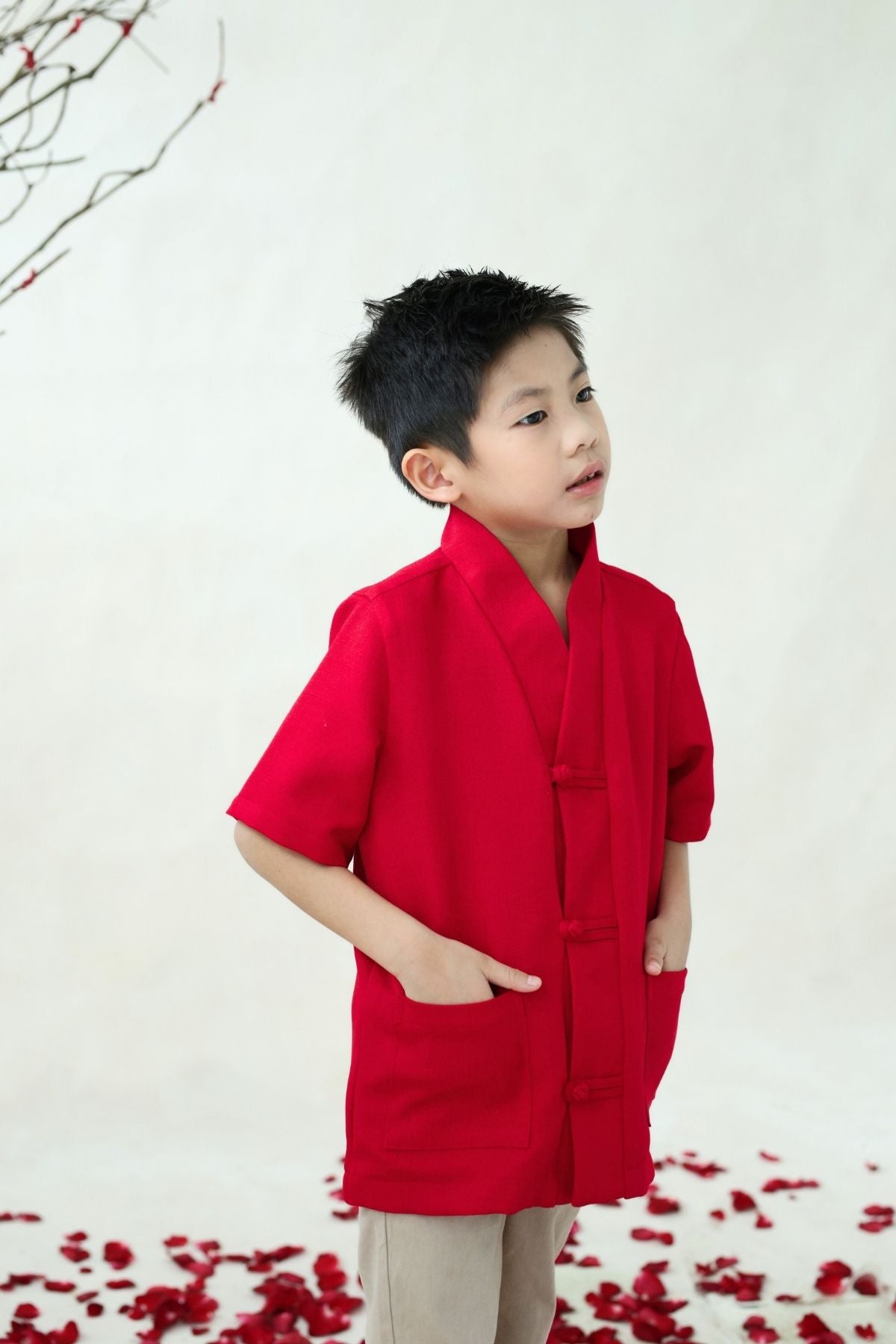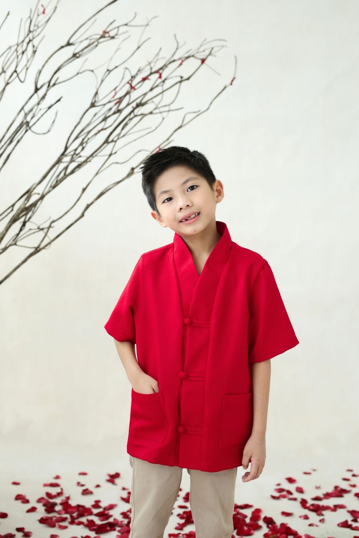 Meet Xi Boy, a modern reinterpretation of the traditional qipao, designed especially for little gentlemen. Crafted in a striking festive red, this piece brings together cultural elegance and contemporary comfort — perfect for the joyful spirit of Chinese New Year.