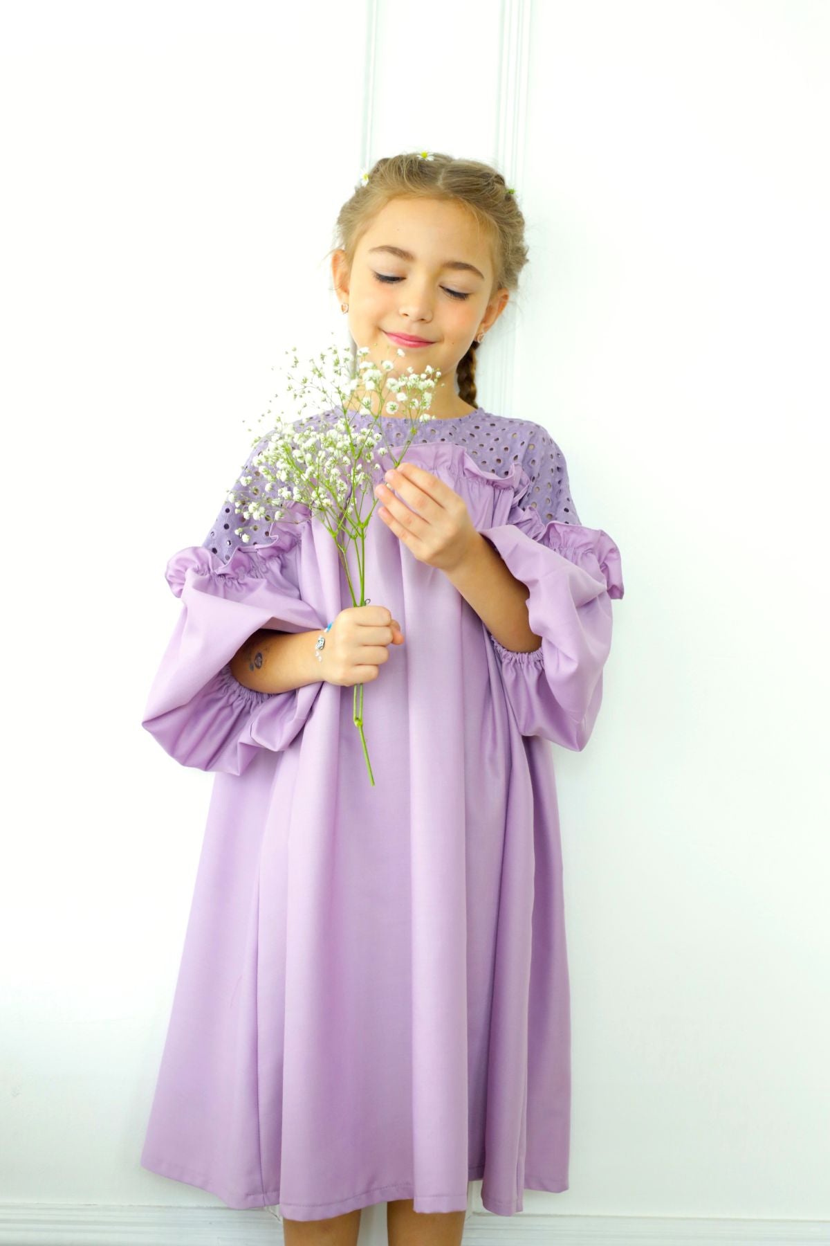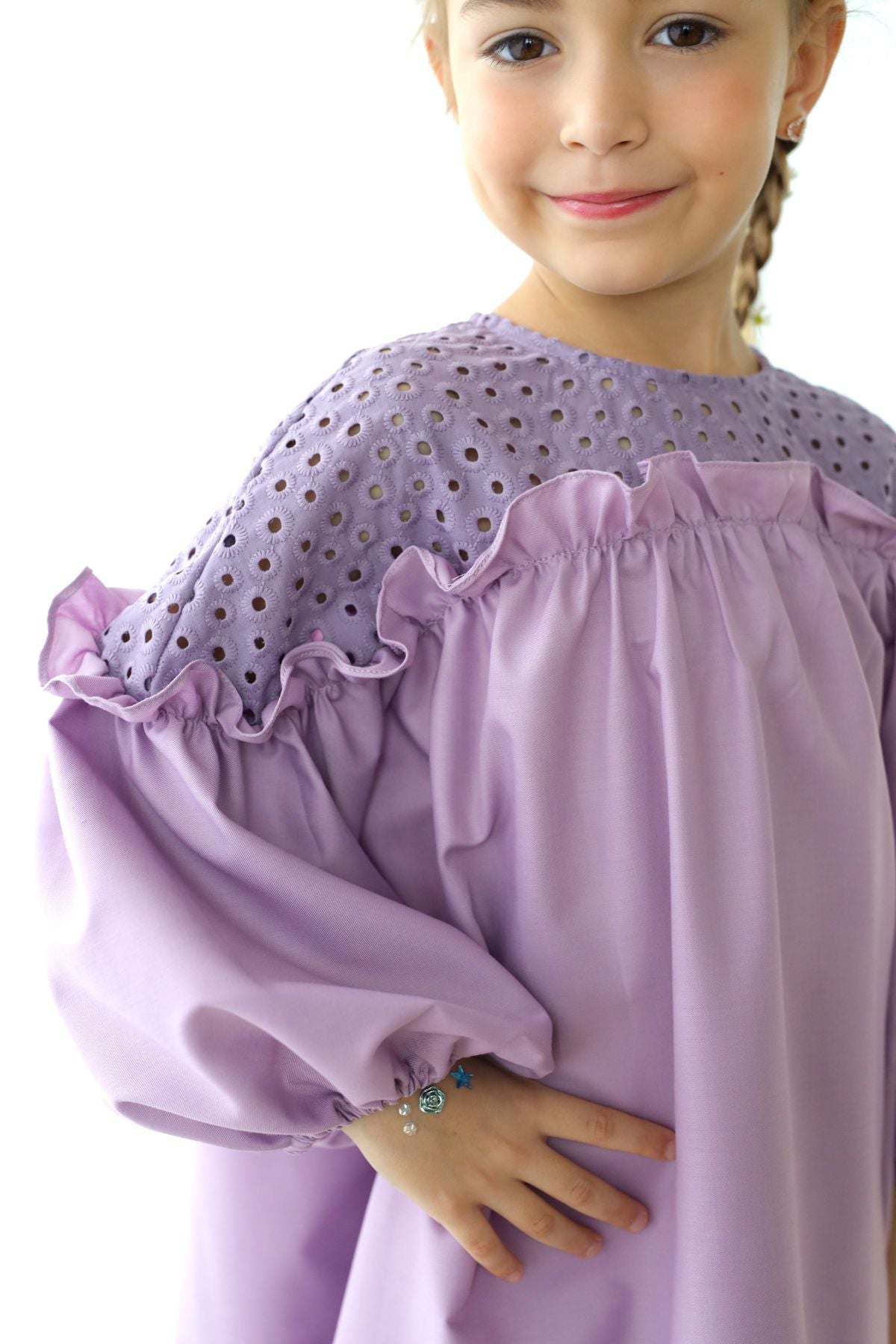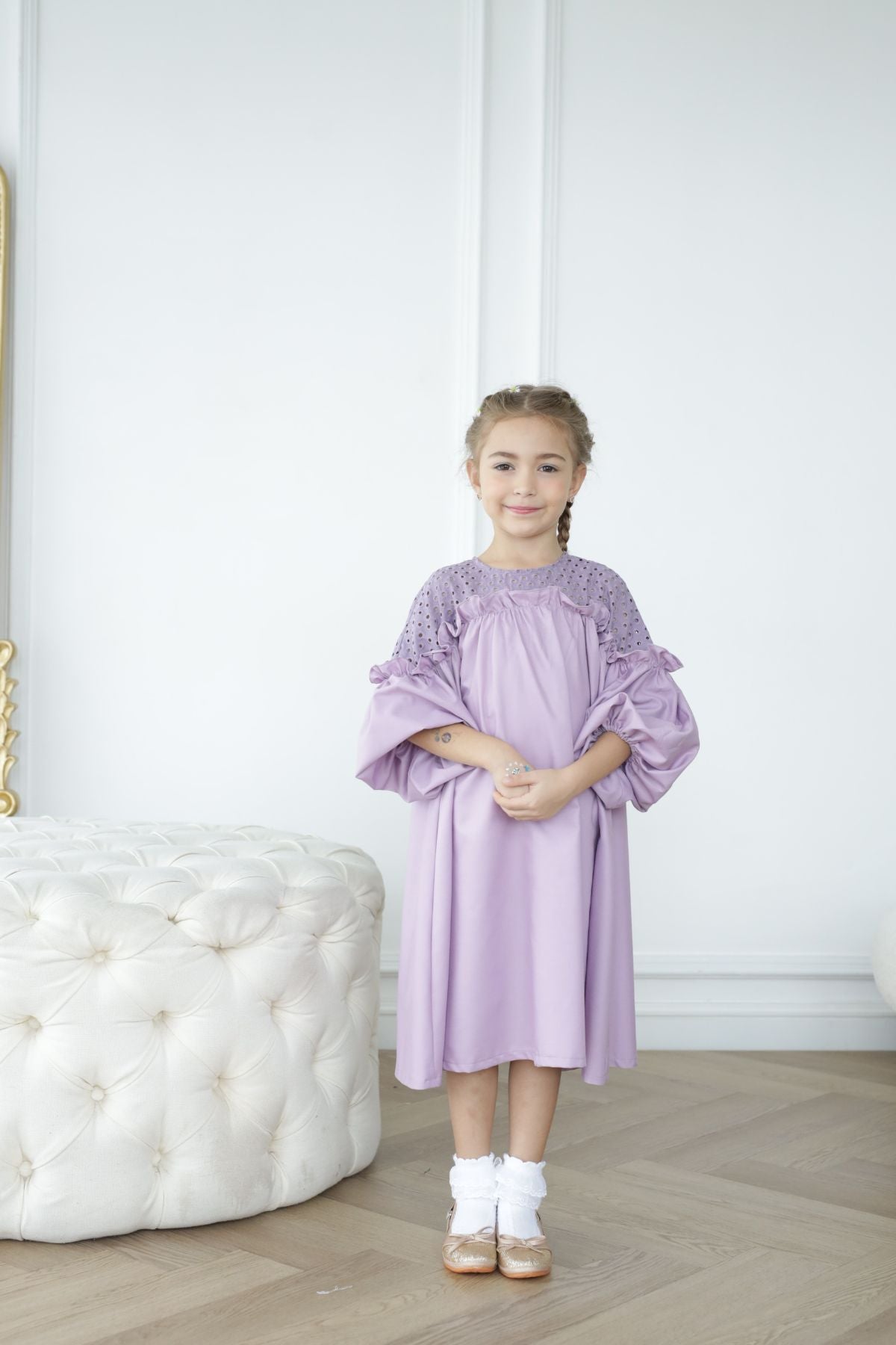 Walk with confidence in this soft beautiful flowy dress. In a midi length with easy pull-over style, plus beautiful details on top, it's a must for their daily wear.